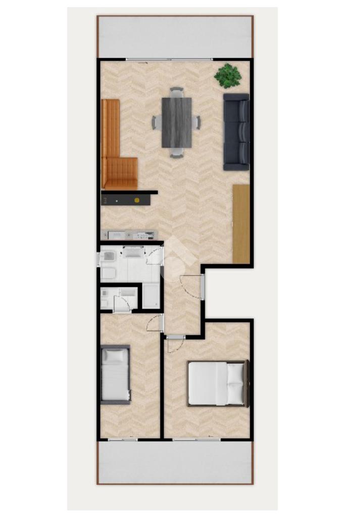 Dal disimpegno si acceda alla zona notte, composta da una camera matrimoniale con bagno, seconda camera, e servizio finestrato.