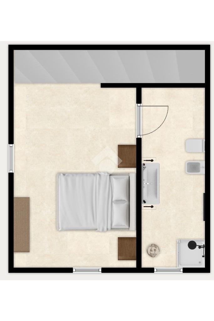 Una scala interna conduce al piano superiore, dove si trova la zona notte composta da un’ampia camera da letto mansardata con travi a vista e da un secondo bagno dal design contemporaneo, dotato di vasca e doccia.