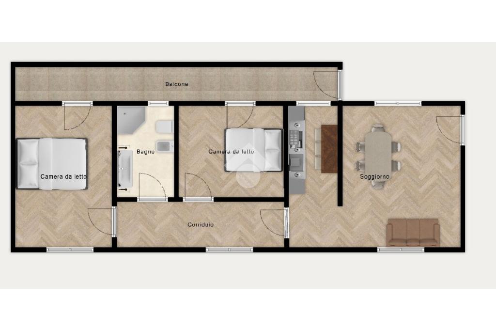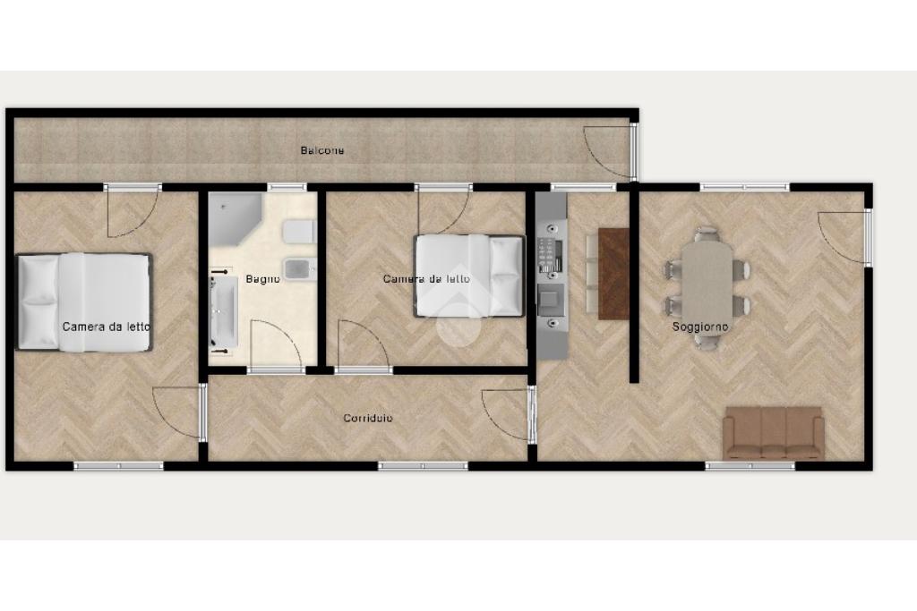 Tutti gli ambienti sono collegati anche da un balcone, che dona luce naturale e continuità agli spazi interni.