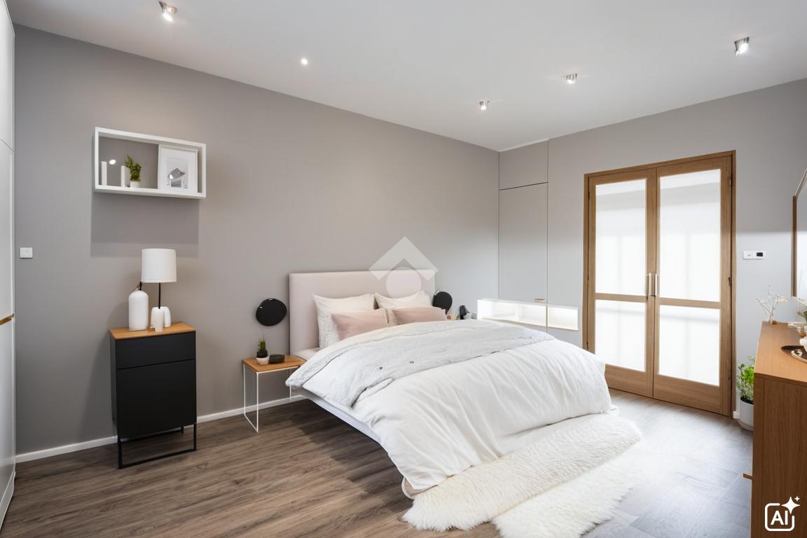 The bright and welcoming living area is enhanced by a fireplace and a classic-style kitchen. From the corridor, one reaches the sleeping area, which includes two bedrooms and a bathroom with a window.