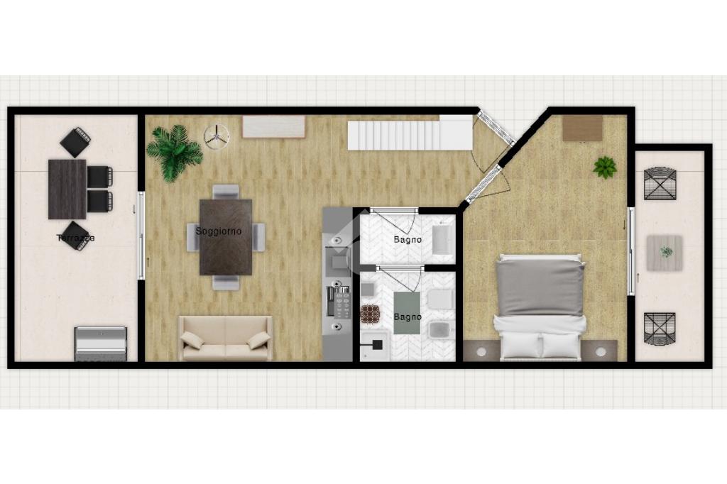 Sul medesimo livello si trovano la camera matrimoniale, dotata di secondo terrazzo, e il bagno finestrato.